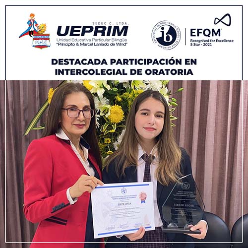 El pasado viernes 5 de agosto se realizó el V Concurso Intercolegial de Oratoria “Santo Domingo de Guzmán” en la ciudad de Guayaquil en la que participaron varios colegios de la costa ecuatoriana. Nuestra estudiante, Srta. Diana Maldonado Silva obtuvo el 3er lugar en el concurso. Extendemos nuestras felicitaciones por su destacada participación, de igual manera a la docente a cargo de la preparación de la estudiante, Mgs. Clara Real.